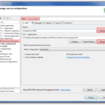 Kolejny krok to skonfigurowanie procesu OpenOCD. W tym celu otwieramy okno External Tools Configurations… i tworzymy nową konfigurację. Wybieramy nazwę dla naszej konfiguracji, klikamy przycisk Browse File System… i wybieramy tam ścieżkę do openocd.exe. Na dole w polu arguments podajemy ścieżki do plików konfiguracyjnych dla sprzętowego debuggera i wykorzystywanego procesora. Dla ST-LINK v2 i STM32F4 będą to: