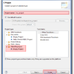 Kiedy mamy już działające środowisko, możemy założyć nowy projekt i skopiować do niego szablon. W tym celu wybieramy polecenie File->New->C Project, a w otwartym oknie wybieramy Makefile project i nadajemy nazwę projektu i klikamy Finish. Kroki te zostały przedstawione na poniższych screenach.