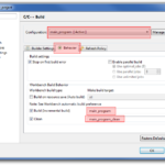 W oknie Properties wybieramy z lewej strony C/C++ Build i klikamy przycisk Manage Configurations… w nowym oknie wybieramy nazwę naszego targetu. Następnie w liście rozwijanej Configuration wybieramy nowo utworzony target i przechodzimy do zakładki Behavior. Tam na dole w polu Build wpisujemy nazwę targetu kompilacji dla make, w tym przypadku będzie to main_program. Możemy tam dodać jeszcze dodatkowe parametry dla komendy make. W polu Clean wpisujemy analogicznie nazwę targeta clean dla naszego builda.