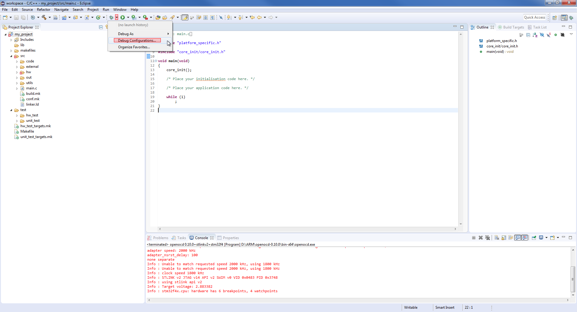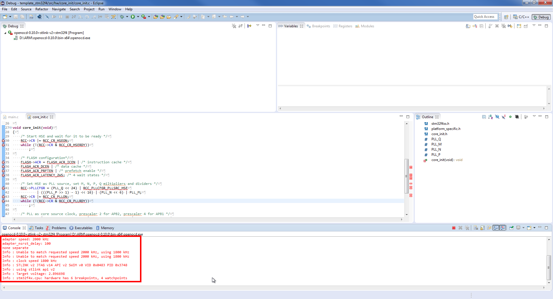 Nadeszła pora na uruchomienie debuggera. Najpierw musi być uruchomiony proces OpenOCD. Następnie uruchamiamy proces GDB. Powinien uruchomić nam się debugger i zatrzymać na pierwszej instrukcji w funkcji main.