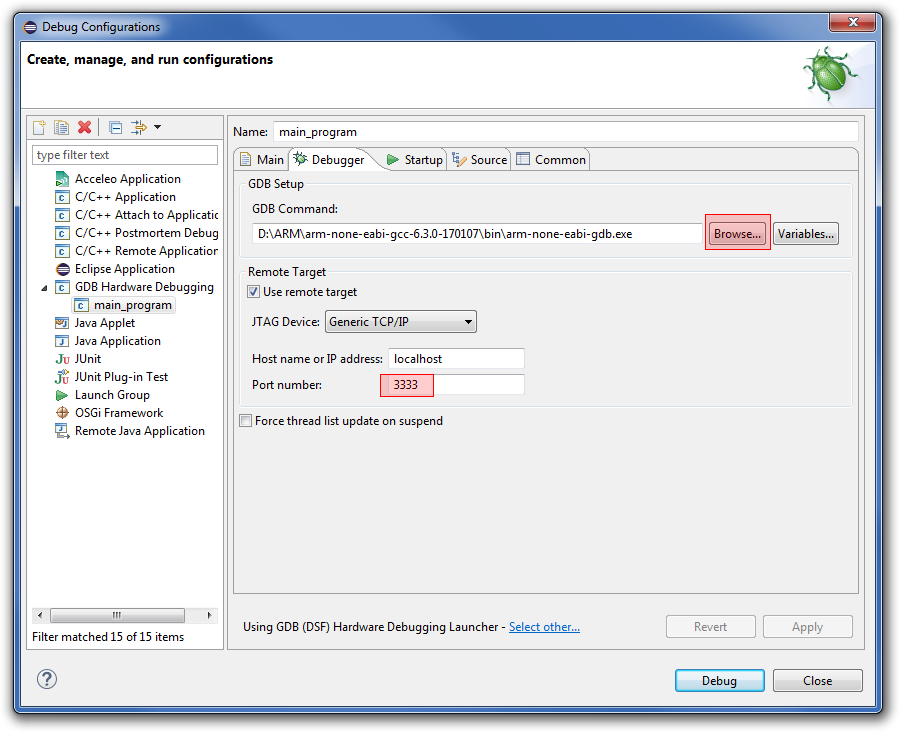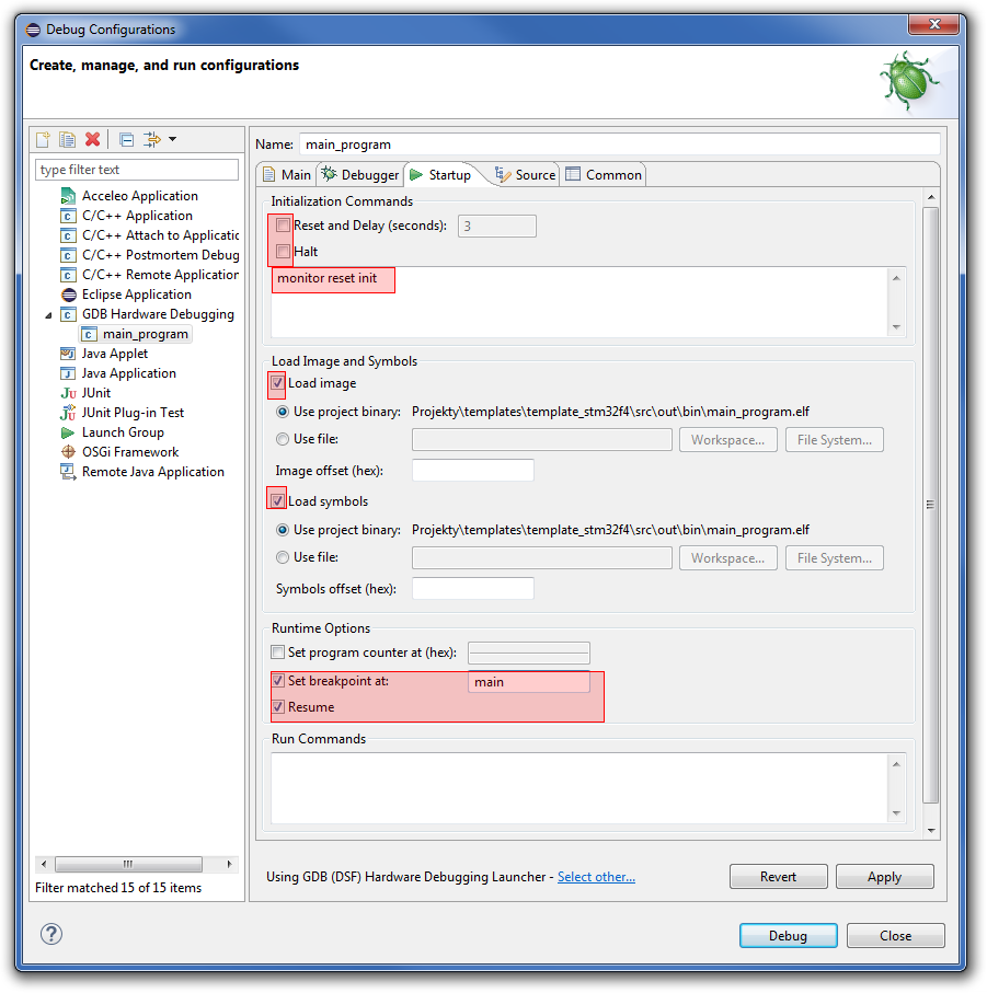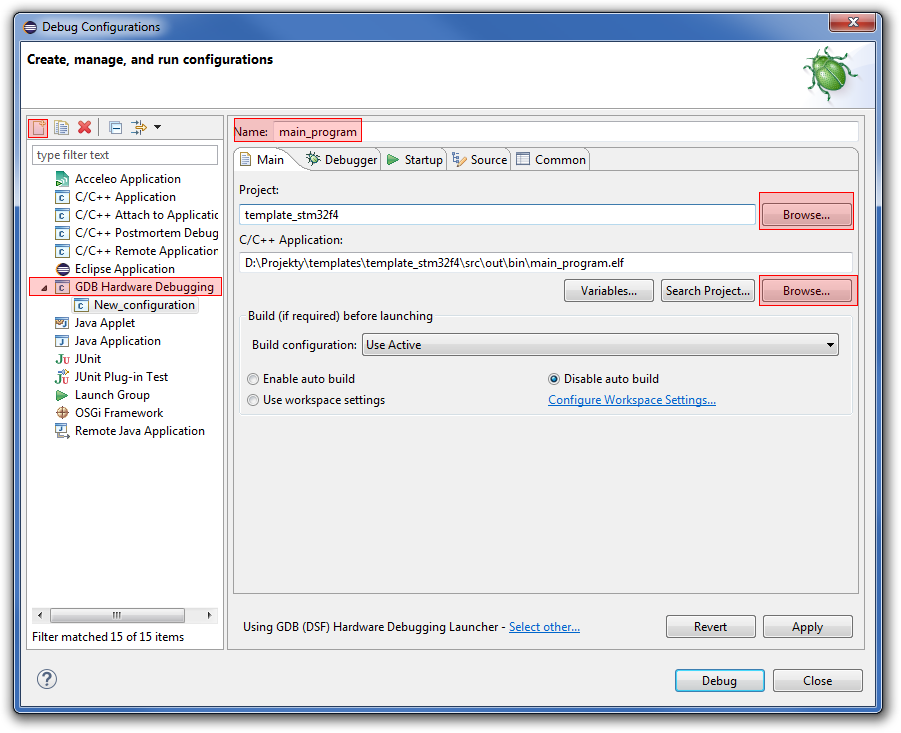 Przed konfiguracją GDB należy zainstalować plugin C/C++ GDB Hardware Debugging, co opisałem wyżej. Następnie wchodzimy do okna Debug Configurations…, wybieramy nową konfigurację GDB Hardware Debugging i uzupełniamy opcje. Najpierw wybieramy nazwę naszej konfiguracji w polu tekstowym na górze. Następnie przechodzimy do zakładki Main, gdzie wybieramy projekt i plik .elf. Warto tutaj też zaznaczyć opcję Disable Auto Build, żeby projekt nie kompilował się za każdym razem, gdy chcemy uruchomić debugger. W zakładce Debugger wybieramy ścieżkę do gdb dla naszego kompilatora i ustawiamy port, na którym GDB będzie komunikował się z OpenOCD. Domyślnie jest to port 3333. W zakładce Startup wybieramy komendy, które mają się wykonać po uruchomieniu GDB. Tutaj każemy GDB zresetować procesor, wgrać program na procesor i skoczyć do funkcji main. Dokładne opcje, które należy wpisać bądź wyklikać zostały przedstawione na screenie.