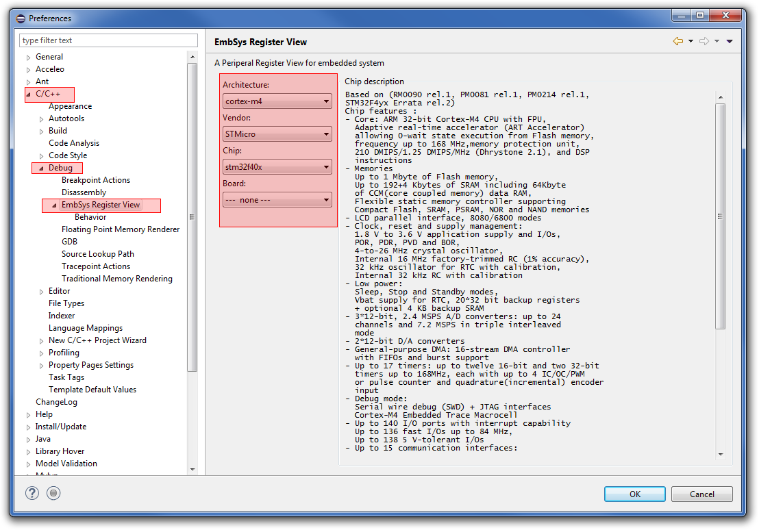 Po zainstalowaniu wtyczki, należy ją skonfigurować. W tym celu otwieramy Window->Preferences i dalej C/C++->Debug->EmbSys Register View. W tej zakładce wybieramy procesor, dla którego chcemy mieć podgląd rejestrów.