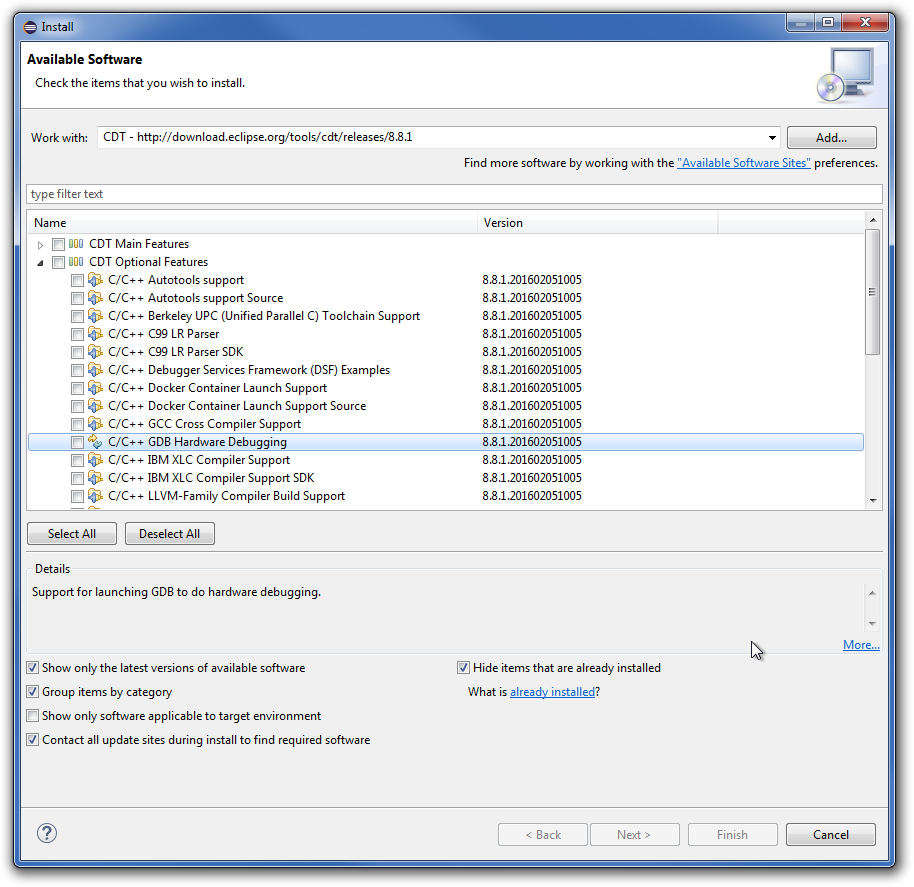 Po chwili powinna nam się załadować lista dostępnych dodatków, z której wybieramy C/C++ GDB Hardware Debugging, wybieramy Next i przechodzimy proces instalacji.