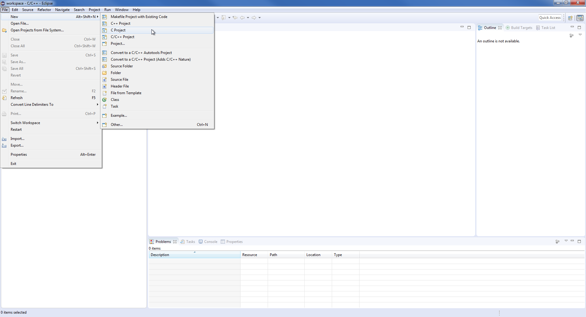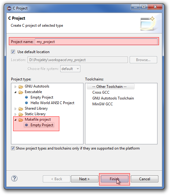 Kiedy mamy już działające środowisko, możemy założyć nowy projekt i skopiować do niego szablon. W tym celu wybieramy polecenie File->New->C Project, a w otwartym oknie wybieramy Makefile project i nadajemy nazwę projektu i klikamy Finish. Kroki te zostały przedstawione na poniższych screenach.
