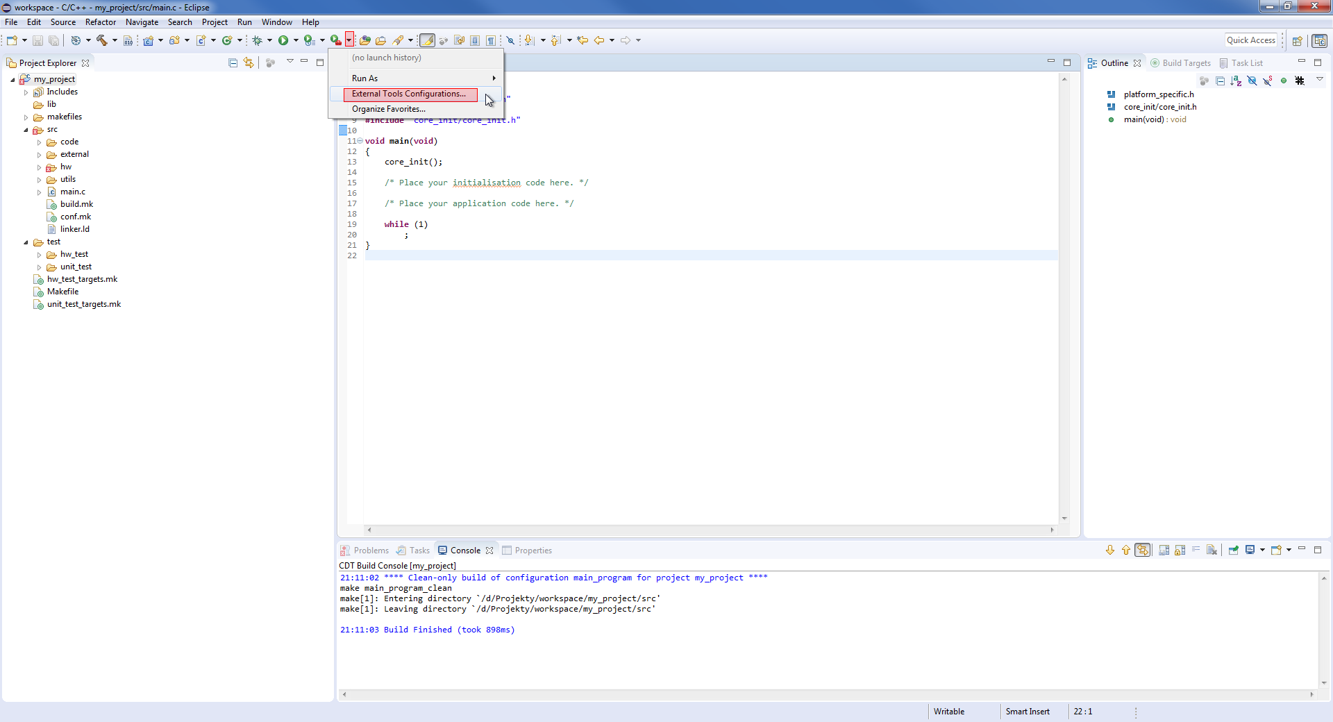 To już cała konfiguracja projektu. Jeżeli wszystko przebiegło pomyślnie, możemy wybrać konfigurację main_program i wykonać build oraz clean z poziomu Eclipse. Poza tym jeżeli klikniemy CTRL + LPM na jakiś include w kodzie, powinien otworzyć się odpowiedni plik. Powinniśmy móc w ten sposób podejrzeć zarówno includy wewnątrz projektu, jak i biblioteki standardowe np. string.h.