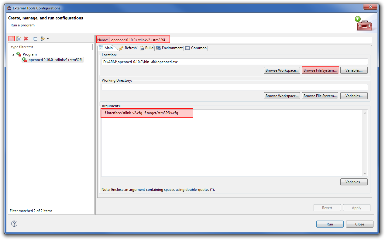 Kolejny krok to skonfigurowanie procesu OpenOCD. W tym celu otwieramy okno External Tools Configurations… i tworzymy nową konfigurację. Wybieramy nazwę dla naszej konfiguracji, klikamy przycisk Browse File System… i wybieramy tam ścieżkę do openocd.exe. Na dole w polu arguments podajemy ścieżki do plików konfiguracyjnych dla sprzętowego debuggera i wykorzystywanego procesora. Dla ST-LINK v2 i STM32F4 będą to: