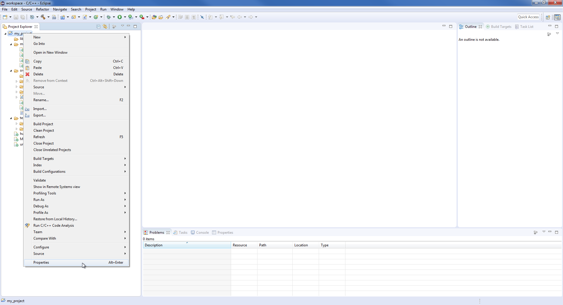 Kiedy mamy już utworzony nowy projekt, kopiujemy tam pliki szablonu na STM32 dostępnego pod linkiem. Następnie musimy pogrzebać trochę w ustawieniach konfiguracyjnych. W tym celu klikamy prawym przyciskiem na projekt i wybieramy opcję Properties. Pierwszą rzeczą jaką zrobimy jest dodanie nowej konfiguracji builda. Domyślnie Eclipse utworzyło konfigurację wywołującą polecenie make all do builda i make clean do cleana. Dodamy nową konfigurację, która wykona build targetu main_program. Jeżeli chcemy z Eclipse uruchamiać kompilację innych targetów np. unit testów albo testów hw musimy powtórzyć tą operację dla każdego targetu.