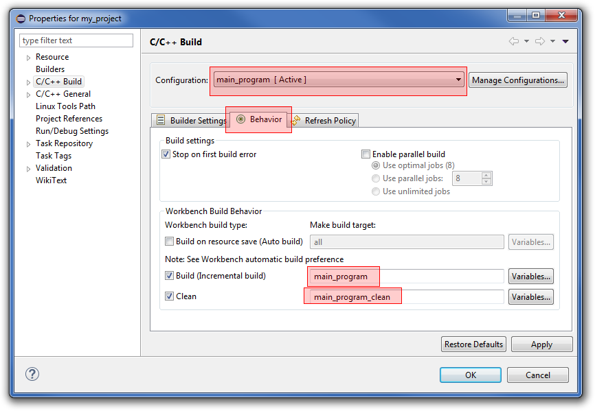 W oknie Properties wybieramy z lewej strony C/C++ Build i klikamy przycisk Manage Configurations… w nowym oknie wybieramy nazwę naszego targetu. Następnie w liście rozwijanej Configuration wybieramy nowo utworzony target i przechodzimy do zakładki Behavior. Tam na dole w polu Build wpisujemy nazwę targetu kompilacji dla make, w tym przypadku będzie to main_program. Możemy tam dodać jeszcze dodatkowe parametry dla komendy make. W polu Clean wpisujemy analogicznie nazwę targeta clean dla naszego builda.