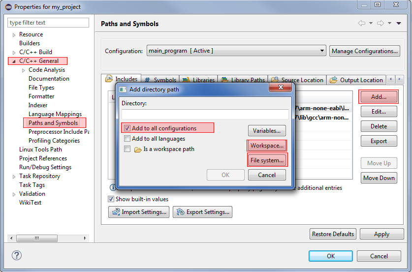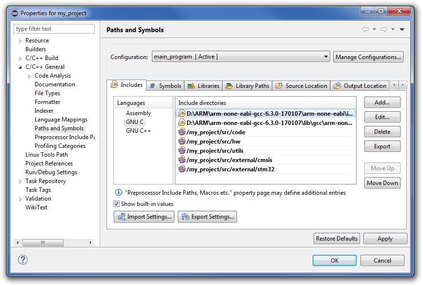 Ostatnią rzeczą, jaką należy skonfigurować, są ścieżki do includów. Dzięki temu Eclipse będzie wiedział, gdzie szukać plików bibliotecznych zarówno projektowych, jak i domyślnych bibliotek kompilatora. Aby skonfigurować ścieżki, wybieramy po lewej stronie grupę C/C++ General, a tam Paths and Symbols. Wybieramy tam zakładkę Includes i po lewej stronie GNU C. Następnie klikamy przycisk Add… i dodajemy nasze ścieżki includów. Warto zaznaczyć opcję Add to all configurations, żeby nie trzeba było tej samej operacji powtarzać dla każdej konfiguracji. Dla ścieżek kompilatora klikamy przycisk File system… ścieżki, które należy dodać to: <ścieżka kompilatora>\arm-none-eabi-gcc-6.3.0-170107\arm-none-eabi\include oraz <ścieżka kompilatora>\arm-none-eabi-gcc-6.3.0-170107\lib\gcc\arm-none-eabi\6.3.0\include. Dla ścieżek lokalnych dla projektu, wybieramy przycisk Workspace…