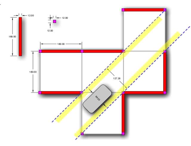 - Rozmiary robota około 100 x 80 mm. Aby możliwa była jazda na skos, szerokość robota nie może być większa niż połowa przekątnej pola, czyli 118 mm. Ideę jazdy po skosie obrazuje rysunek.