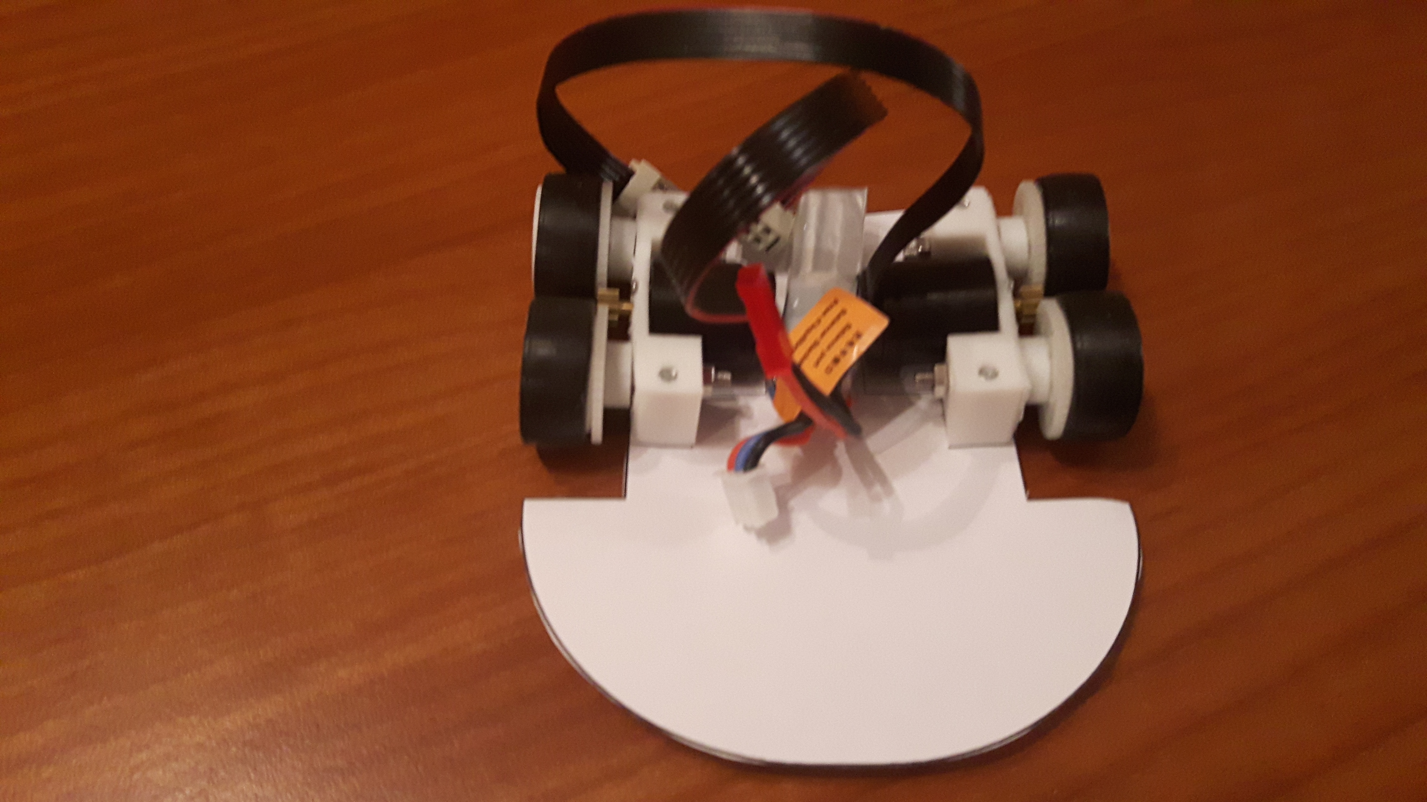 Złącza od silników zdecydowałem się umieścić przed mocowaniami, ponieważ nie byłem w stanie dobrze ich upchnąć z tyłu. W wyznaczeniu odpowiedniego miejsca na te złącza pomogły mi wycinanki. Wydrukowałem sobie kształt PCB, wyciąłem i przykręciłem do niego mocowania silników, co widać na powyższym rysunku. Po empirycznym sprawdzeniu kilku miejsc, gdzie mógł bym umieścić złącza silników, w końcu wybrałem optymalną miejscówkę. Pomiędzy złączami silników zdecydowałem się umieścić złącze na moduł IMU, w przedniej części znalazło się miejsce dla procesora i sterownika diod. Złącza do programatora i bluetootha umieściłem po bokach tak, aby był do nich łatwy dostęp. Zostało mi dużo miejsca pomiędzy zasilaniem znajdującym się z tyłu, a wszystkimi innymi elementami umieszczonymi przed mocowaniami. Wykorzystałem to miejsce na driver silników. Rozmieszczenie kluczowych elementów jest widoczne na pierwszym rysunku.