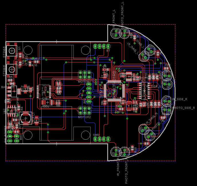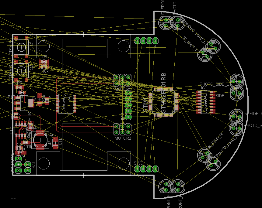 Pierwszym krokiem do stworzenia PCB było określenie wymiarów. Byłem tutaj ograniczony przez program Eagle, który wykorzystałem do zrobienia projektu. Maksymalny rozmiar płytki możliwy w darmowej wersji programu to 80x100mm. Minimalna szerokość musiała być taka, aby zmieściły się dwa mocowania silników – długość jednego to 23mm, a szerokość to 40mm. Szerokość z zamontowanymi kołami to 50mm. Ostatecznie zdecydowałem, że pomiędzy silnikami umieszczę jeszcze baterię i szerokość wyniesie 60mm. Przed mocowaniami silników po zostawieniu miejsca na koła zdecydowałem się na zwiększenie szerokości do 80mm i wyprofilowanie kształtu półkola. Wzorowałem się tutaj na istniejących robotach. Takie rozwiązanie jest standardem, a przykłady można obejrzeć tu(należy wybrać Projects->Micromouse), tu i tu. Jak bym chciał być pro, to mogłem jeszcze tam wyciąć ze środka część PCB dla odchudzenia konstrukcji. Jednak nie byłem pewny, czy się ze wszystkim zmieszczę, a dopóki nie będę chciał rywalizować z najlepszymi Micromouse na zawodach w Japonii raczej nie będę musiał dbać o każdy gram. Ostateczny kształt płytki można obejrzeć na rysunku. Obraz jest mocno zaciemniony przez żółte linie reprezentujące niedokończone połączenia, których oczywiście zapomniałem wyłączyć do screena. Jednak obrys robota i rozmieszczenie najważniejszych elementów są widoczne.