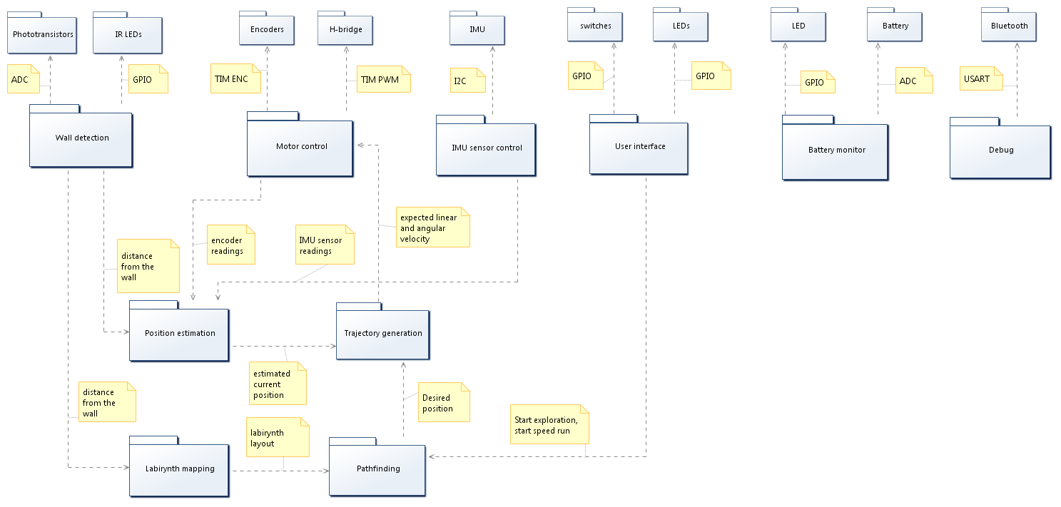 Debug – moduł debugowy. Informacje debugowe mają być drukowane przez interfejs UART, do którego można podłączyć moduł Bluetooth. Możliwe, że będzie również opcja wydawania robotowi komend przez konsolę debugową np. żeby wyświetlić aktualny rozkład wykrytych ścian w labiryncie.