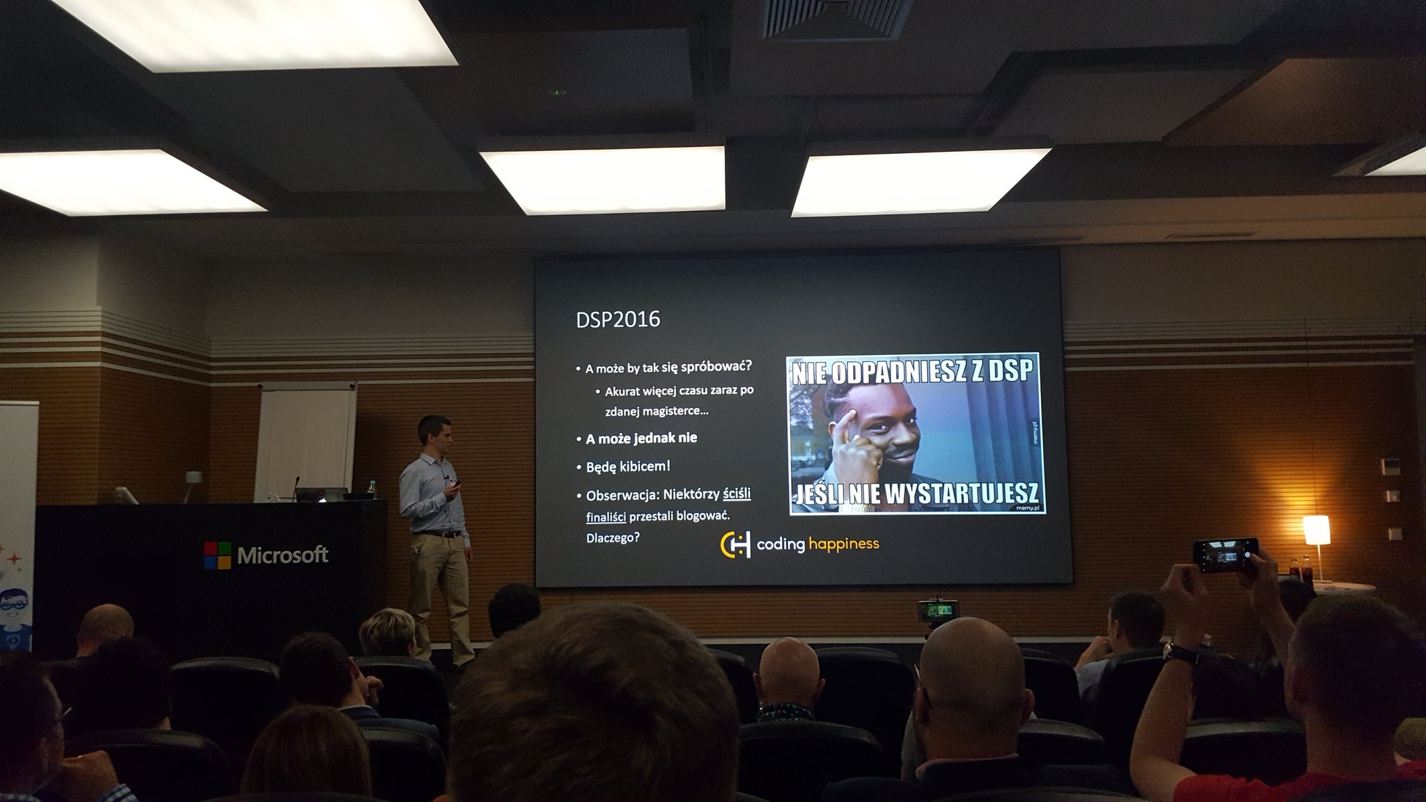 Te dwie prezentacje potraktuję wspólnie, ponieważ pokazują one prawdziwą siłę konkursu DSP. Dzięki niemu młody człowiek – który zaczyna studia, jak w przypadku Michała, albo nawet szykuje się do matury jak Mateusz – ma okazję zaprezentować się światu, zebrać doświadczenia od starszych programistów i zmobilizować do działania. Efekty są piorunujące, o czym świadczy sytuacja opisana przez Michała, który poszedł na rozmowę rekrutacyjną i usłyszał od rekruterów, że czytali jego bloga.