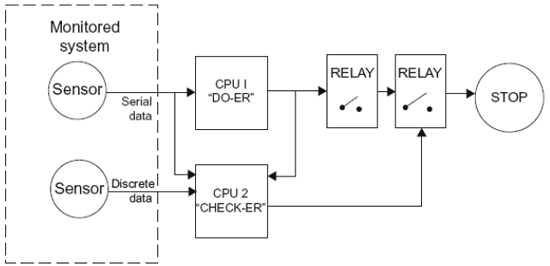 Omówię teraz kilka rozwiązań architektury systemu starających się spełnić wymagania dotyczące systemów bezpieczeństwa. Jedną z możliwości jest zastosowanie jednego procesora realizującego podstawowe funkcjonalności systemu i drugiego procesora działającego jako nadzorca sprawdzający, czy pierwszy procesor działa poprawnie. Jeżeli nadzorca wykryje jakiś błąd, może wprowadzić system w stan bezpieczny. Sam procesor podstawowy również może przejść w safe state.
