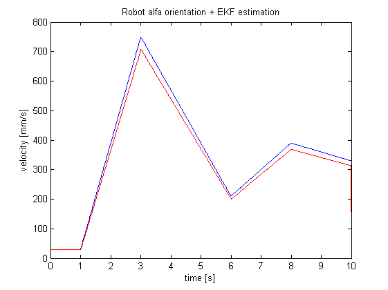 Kolejną obserwacją jest fakt, że największy wpływ na niedokładność oszacowania ma obrót. Wynika to z faktu, że to $latex \alpha &s=2$ jest odpowiedzialny za nieliniowość funkcji dla x i y – wprowadza tam funkcje trygonometryczne. Jak wspomniałem wcześniej – EKF dokonuje linearyzacji dla punktu pracy wyznaczonego przez aktualną estymatę stanu. Im mocniej ta estymata odbiega od rzeczywistości, tym większy błąd.