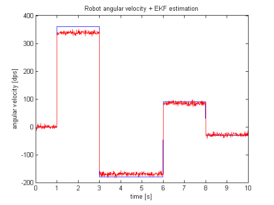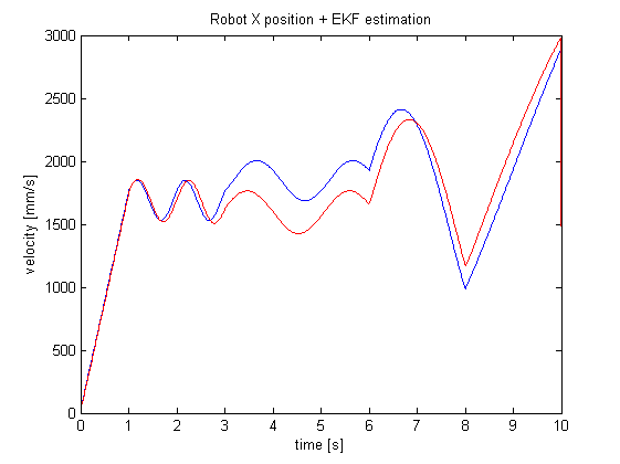 Kod symulacji w MATLABie można znaleźć na moim GitHubie. Symuluję w niej ruch robota z zadanymi profilami prędkości postępowej i obrotowej, odczyty z enkoderów i żyroskopu oraz implementuję EKF. Wyniki są prezentowane na wykresach. Estymata EKF poszczególnych zmiennych stanu w czasie wygląda następująco (niebieska linia to rzeczywista wartość, czerwona to EKF):