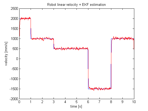 Zachowaniem EKF można manipulować modyfikując parametry takie jak warunki początowe $latex \mathbf{x}_0, \mathbf{P}_0 &s=2$ oraz macierzami kowariancji szumu procesowego i pomiarowego – $latex \mathbf{V}, \mathbf{W} &s=2$. Możemy w ten sposób sugerować, czy filtr ma bardziej polegać na danych z czujników, czy wewnętrznym obliczeniom stanu.