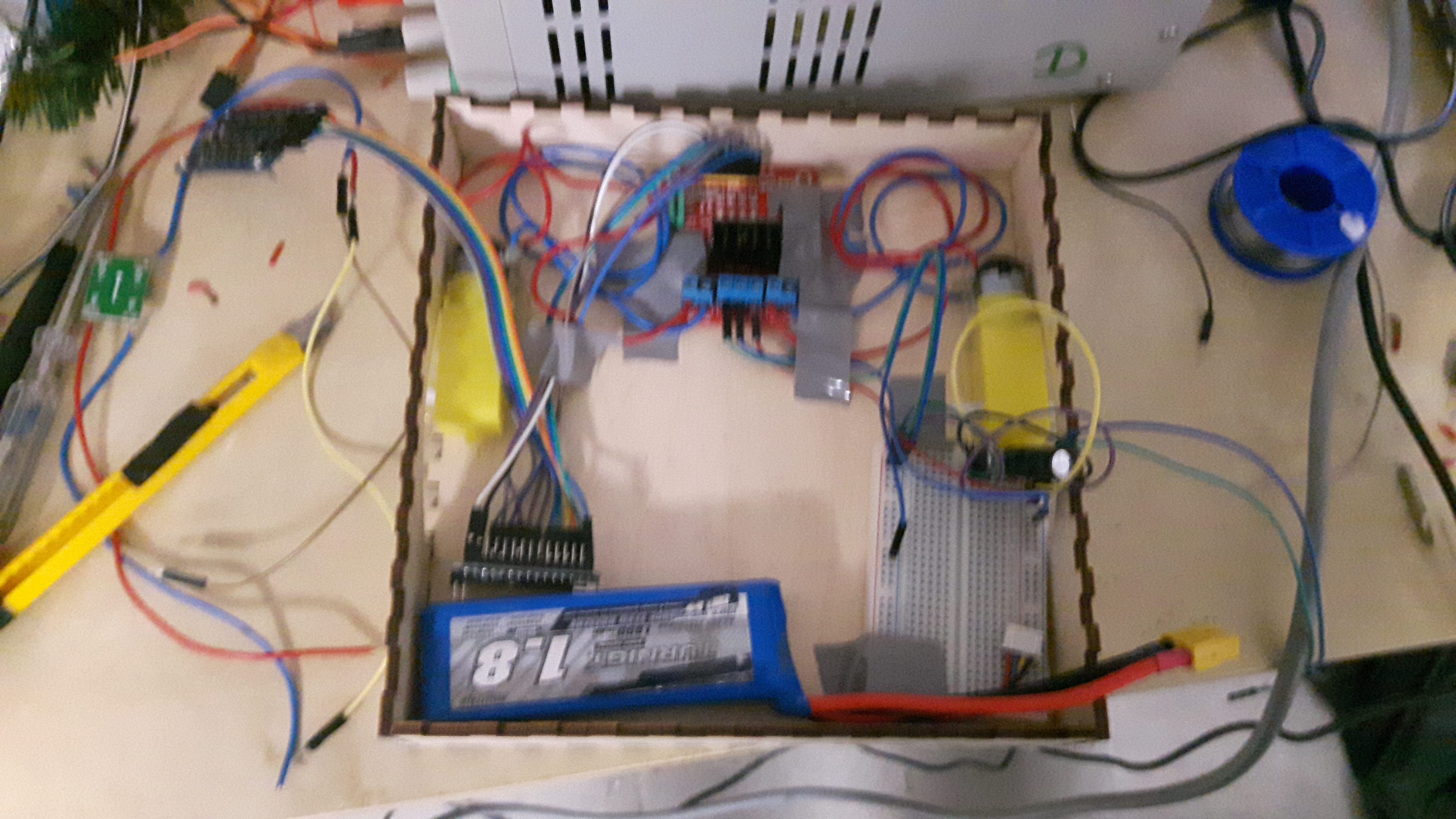 Miałem też wielki problem z zasilaniem, zwykłe zasilacze dawały za mały prąd i powodowało to różne dziwne problemy. A to jeden silnik się nie kręcił, a to Arduino się wyłączało. Dopiero jak skołowaliśmy zasilacz laboratoryjny dało się normalnie pracować.