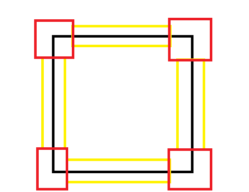 Na żółto zaznaczone są progi wykrycia każdej ze ścian. Aktualnie ustawiłem je z pewnym zapasem na 20 mm. Ostateczne wartości prawdopodobnie wybiorę po testach polowych. Zaznaczyłem również na czerwono narożniki. Wykrycia z tamtych rejonów nie będą przeze mnie uwzględniane, ponieważ istnieje ryzyko wykrycia nie tej ściany którą chcemy. Aktualnie próg ustawiłem na 30 mm, prawdpodobnie docelowo będzie mniejszy.