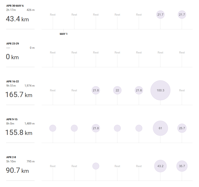 Od początku roku przejechałem już 800 kilometrów. To tyle co przez cały zeszły rok. Rekordowym miesiącem był kwiecień: