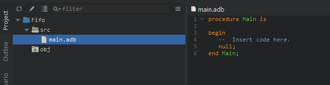 Na początku tworzę przy pomocy GPS nowy projekt o nazwie fifo. Wygenerował się projekt z pustą funkcją main (widoczny poniżej na obrazku). Następnie dodaje nowy package o nazwie fifo i zaznaczam, żeby utworzył od razu implementation file. Pojawiają się pliki fifo.ads zawierający specyfikację package’a oraz fifo.adb zawierające body, czyli implementację.