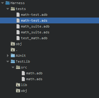 Mamy główny projekt Harness zawierający folder tests z plikami implementującymi unit testy. Mamy implementacje Test Case (math-test), Test Suite (math_suite) i runnera (test_math). Przyjrzyjmy się zatem implementacji. Oto zawartość math-test.ads: