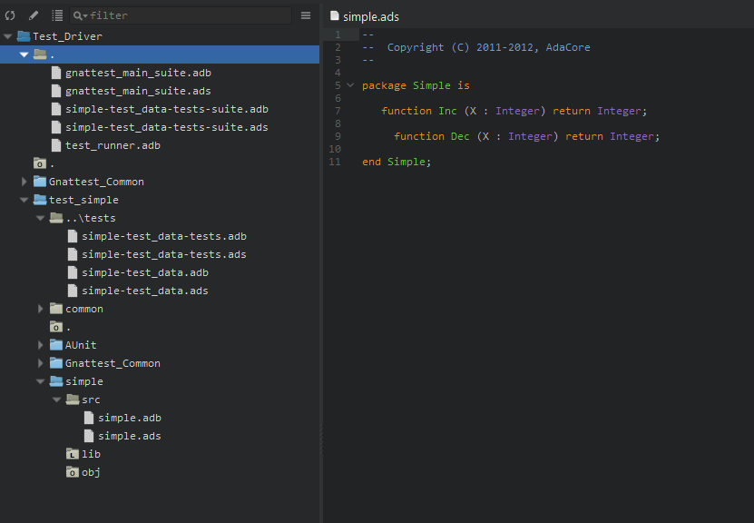 Podobnie jak w przypadku AUnit, razem z toolchainem otrzymaliśmy przykłady GNATtesta. Można je znaleźć w folderze GNAT/2018/share/examples/gnattest. Przykłady zawierają pliki podstawowego projektu, do którego następnie generujemy testy przy użyciu GNATtest. Do każdego przykładu dołączony jest readme ze szczegółowym opisem. Ja jednak nie korzystałem z GNATtesta w konsoli, tylko wygenerowałem testy z GPSa. Tym razem przynajmniej się skompilowały i uruchomiły bez wymaganej interwencji. Oto struktura wygenerowanego projektu:
