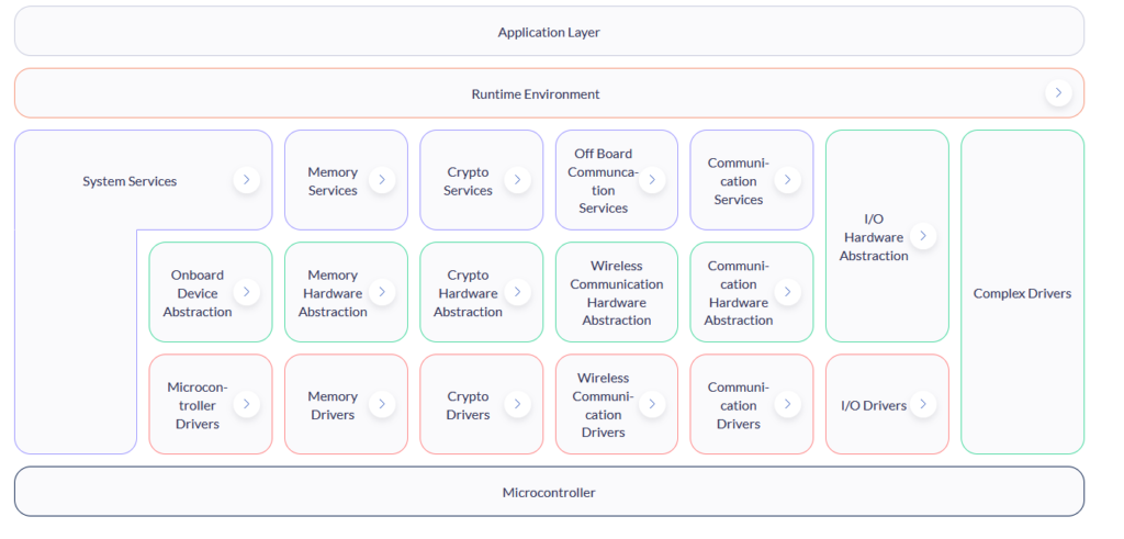 - Basic Software – to na diagramie wszystkie trzy rzędy między RTE a mikrokontrolerem. Tutaj znajdziemy drivery peryferiów, RTOSa, protokoły komunikacyjne itp.